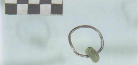 Ohrring mit Perle - Silber. Aus dem Haus in Sektor IV. Spätantike. Anello da orecchino con perla, rinvenuto nella casa del settore IV. Argento e pasta vitrea. Etā tardoantico.